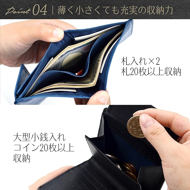 【薄く 小さく たくさん入る 2つ折り財布】 薄型コンパクト財布でありながら、札20枚・小銭20枚・カード10枚収納可能な充実の収納力。沢山収納してもスナップボタンが財布の開きを防ぎます。小さなボディに驚きの収納力を兼ね備えた コンパクト財布 です。