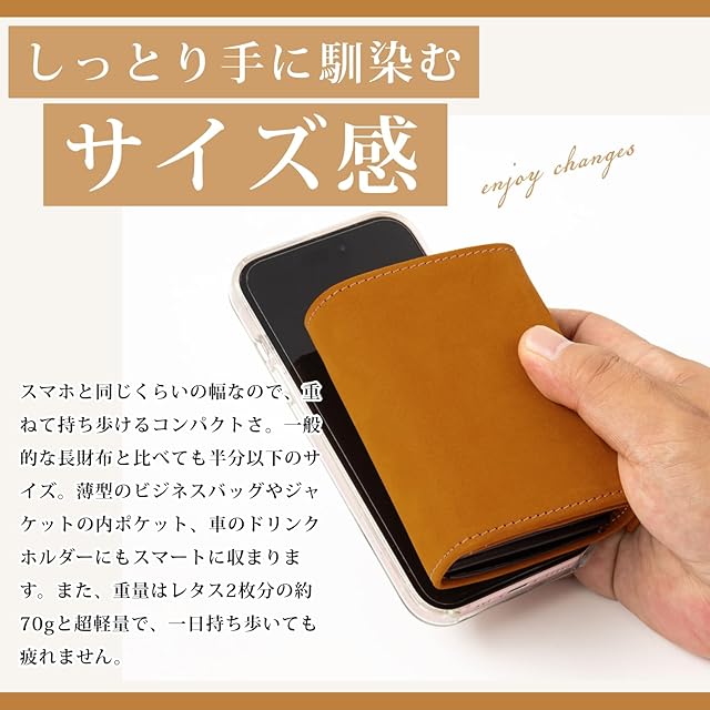 【しっとり手に馴染むサイズ感】スマホと同じくらいの幅なので、重ねて持ち歩けるコンパクトさ。一般的な長財布と比べても半分以下のサイズ。重さは約70gと超軽量。また、利き腕 右利き・左利き 関係なく、取り出しやすく使いやすい構造になっています。