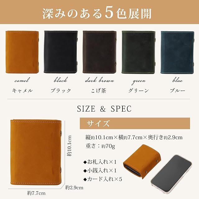 【サイズ】約縦:10.1cm 横:7.7cm 奥行:2.9cm 【重さ】:約70g 【カラー】キャメル、こげ茶、ブラック、ブルー、グリーン
