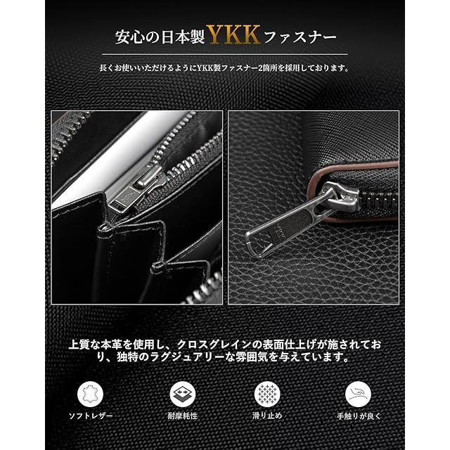 Alivernの長財布は、高級な本革を使用し、一流の革職人によって丁寧に作られた逸品です。YKKファスナーを採用し、耐久性と操作性を両立。スキミング防止機能を搭載し、大切な情報を守ります。カード収納は15枚可能で、お札入れ、小銭入れ、通帳ポケットも備えた機能的な設計。ビジネスシーンに映えるスタイリッシュなブラックカラーで、上質な牛革の風合いが魅力です。大容量ながらスマートなデザインで、ビジネスマンの必需品として長くご愛用いただけます。収納力と機能性を兼ね備え、使いやすさを追求した紳士用の長財布です。