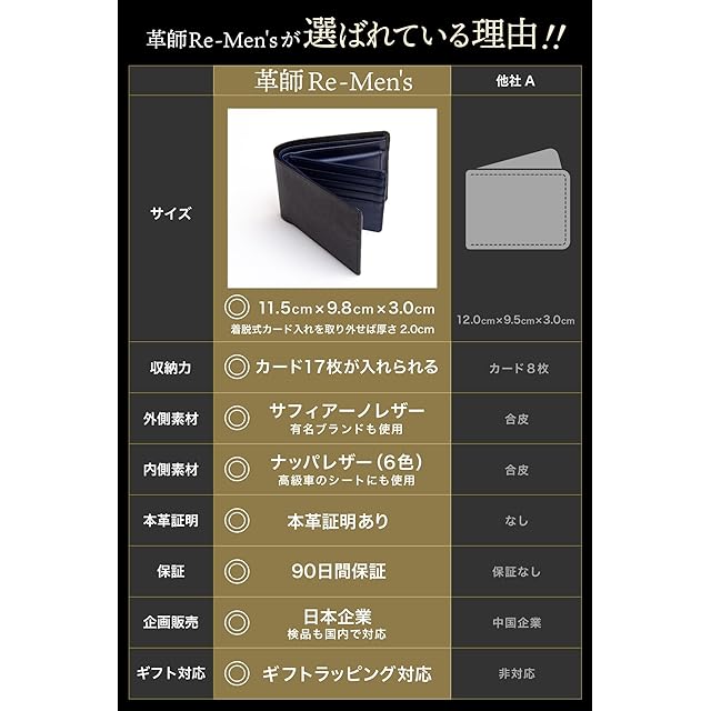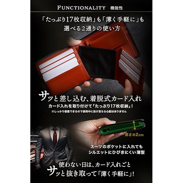 【特色】カード収納が17枚。カードシートは着脱式。/【素材】外革:耐久性・撥水性が高いサフィアーノ(イタリアンレザー)/内革:高級車のシートにも使われるナッパレザー [専門機関による本革鑑定取得済み]