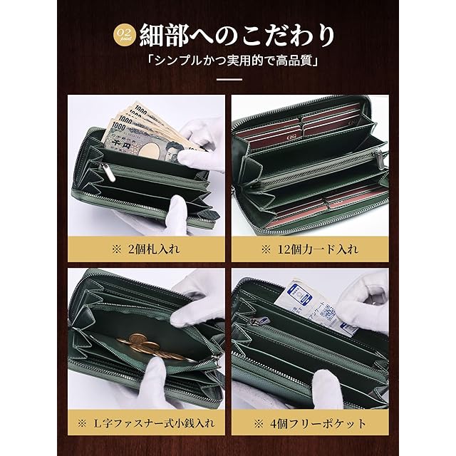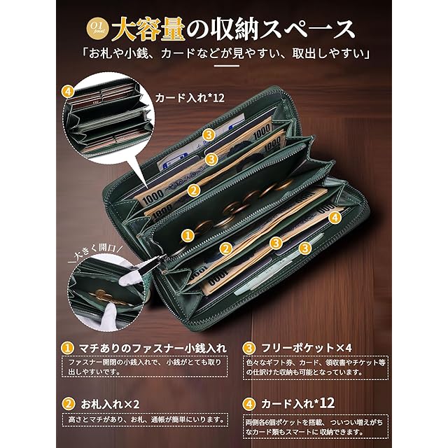 ▶【ポイント2-大容量で、収納抜群】:上質牛革も機能も使い心地もこだわった、贅沢な長財布です。カード、お札、コインケースと分かれた収納は、 クレジットカードや領収書などがしっかり入り、管理しやすく便利です。ファスナー開閉の小銭入れで、小銭がとても取り出しやすいです。