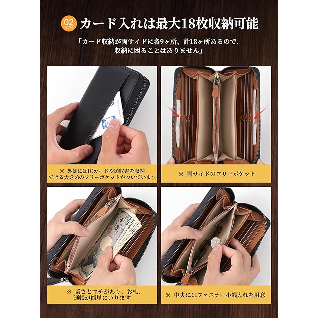 【長財布 大容量 収納力抜群】:カードポケット18枚、札入れ4か所、フリーポケット2か所、ファスナー付き小銭入れ1か所を備えた大容量設計。通帳や領収書、レシートもすっきり収納でき、日常から出張・旅行まで幅広く活躍します。