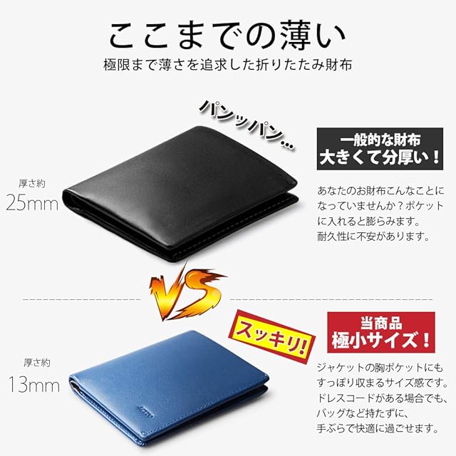 【驚きの薄さを実現】最薄クラスの薄さ20mmしかありません。多くのお客様は別財布を使用した後、「財布は大きすぎて、ポケットに入らない」、また、「厚すぎてポケットにぎりぎり入れて、邪魔になる」、「多くの財布はコインケースはボックス型となり、硬貨は多く収納できるけど、カードは割れやすい」との声を聞きました。それぞれのご意見を合わせて、最終的に主に札入れとカード入れのシンプルな設計で、薄くて軽いのは特徴、との皆様に最適な二つ折り財布が仕上がりました。他の財布ほどの容量はないですが、日常必要な容量に対応するなら、全然問題なくて、いつでも身軽に出かけられます。