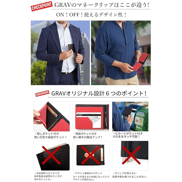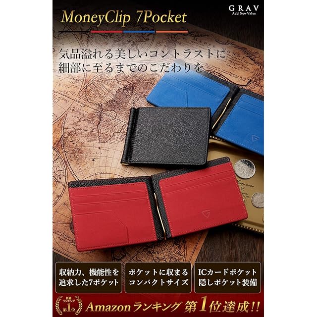 ✅【 ありきたりなマネークリップじゃつまらない 】 コスパが優秀であることは大前提、所有欲を満たしてもらう商品に。 使いやすさにこだわった機能性豊かな7ポケットにオリジナル設計。 充実した収納力と鮮やかなデザイン性が洗練された大人の男性に相応しいマネークリップの登場です。<br><br> ✅【 機能性に遊び心をプラスした7ポケット 】 通常のカードポケットの他に、ICカードポケットやプライベートカードの収納にピッタリな隠しポケットまで。 全部で7つものポケットを搭載したこちらのマネークリップ。 お札の札留めとしてだけではなく、切符や駐車券などのチケット・レシート類の収納にも便利な簡易ポケットも装備。 <br><br> ✅【 気品溢れる洗練されたデザイン 】 キャッシュレス化が進む現在。 持ち歩く財布はカード収納がメインに。 薄くて持ち運びしやすいコンパクトサイズ。 素材と色のコントラストが高級感をさらにUP! ワンランク上の存在感を醸し出すマネークリップとなっております。 <br><br> ✅【 サイズ×素材 】サイズ:縦88mm、横115mm、厚さ10mm 日本紙幣ベストサイズ!海外製品には日本紙幣に対応していない規格もありますのでお気をつけ下さい。 素材:高品質PUレザー カードポケット部分はimitation microfiberを採用!カードの出し入れのしやすさを改善いたしました。 仕様:内側 カード入れ×4、簡易ポケット×1、隠しポケット×1 外側 ICカード入れ×1 <br><br> ✅【 GRAVは日本ブランド 】商品到着後の初期不良はもちろんのことイメージ違いなどについても、ご購入から30日以内の場合全額返金あるいは無料交換にて対応させていただきます。 また、クリップ(金具)にはメーカー1年がついております。 GRAVではアフターサービスにも力を入れておりますので、商品使用後でありましてもお困りの事がありましたらお気軽にお問い合わせください。