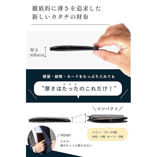 【キャッシュレス時代の新定番】薄型設計&軽量なのにすべてが1つに!大容量かつスリムなフォルム。重さはたったの40gで超軽量!薄さと収納力を両立。硬貨・紙幣・カード全てをコレ1つで収納可能。でも"驚き"の厚さ8mmと薄くてコンパクトなので、ポケットに入れてもかさばりません。