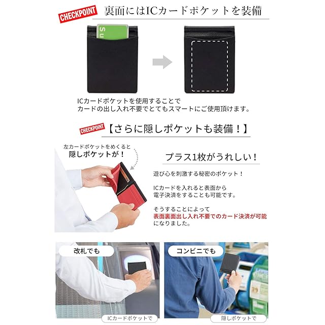 ✅【 サイズ×素材 】サイズ:縦88mm、横115mm、厚さ10mm 日本紙幣ベストサイズ!海外製品には日本紙幣に対応していない規格もありますのでお気をつけ下さい。 素材:高品質PUレザー カードポケット部分はimitation microfiberを採用!カードの出し入れのしやすさを改善いたしました。 仕様:内側 カード入れ×4、簡易ポケット×1、隠しポケット×1 外側 ICカード入れ×1