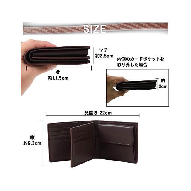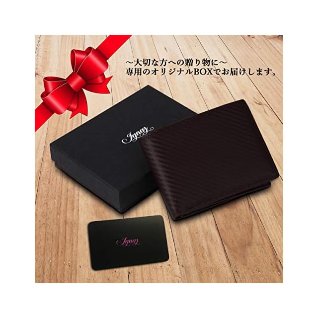 【大人シックで上品なデザイン】 ☑ 「収納重視派」「スマートさ重視派」のどちらにもご満足いただける二つ折り財布です。 ☑表面は高級感漂うカーボンレザーを採用し、手持ち感、肌触り感が良く耐久性にも優れています。 ☑大人シックなデザインとカラーは、ビジネス、フォーマル、カジュアルシーンで、上品で落ち着いた大人の男性を演出します。デザインと機能性にこだわる方へおすすめしたい逸品です。