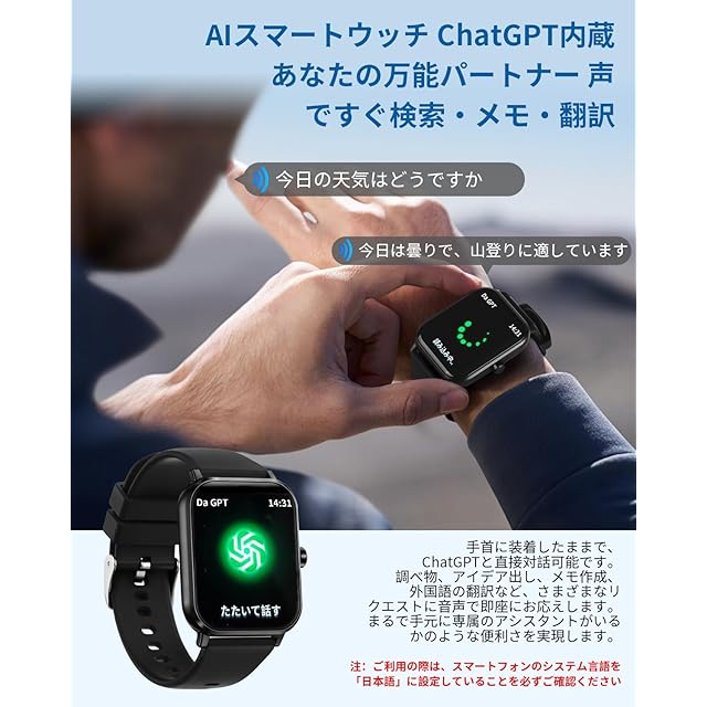 【日本語専用AIアシスタント - ChatGPT内蔵】お手持ちのスマートフォンの言語設定が日本語の場合、本製品のChatGPT機能が完全に作動します。日本語での音声質問、翻訳、スケジュール管理、文章作成などを楽しめ、あなたの最強の日本語AIパートナーとなります。本スマートウォッチはChatGPTを高度に統合。手首から、音声で直接ChatGPTに質問できる新次元のスマート体験を実現します。スマートフォンが手元になくても、リマインダー設定やToDoリストの作成、アイデアのヒントを得るなど、多彩なタスクを音声一つで完了できます。あなたの指示をインテリジェントに理解し処理する、手元のAIパーソナルアシスタントとして、日々の生活や仕事、学習をよりスマートに効率化します。