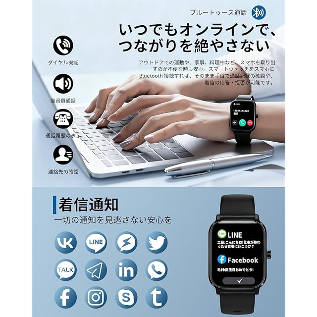 【スマートな通知で連絡を見逃さない】最新Bluetoothを搭載し、安定した高速接続を実現。電話の応答やメッセージの確認を手元で快適に行えます。大切な連絡をいつでもキャッチし(LINE、Facebook、Instagram)、スマホを取り出す手間を軽減。仕事や運動中にも便利です。