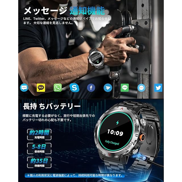 【Bluetooth通話&メッセージ通知機能&音声アシスタント】本スマートウォッチはスピーカー&高性能マイクを内蔵され、携帯電話を出さなくても、スマートウォッチでの通話を実現しました。スマホと接続された後に、着信の応答と拒否/電話をかけることなどができます。通話履歴も表示され、通話記録を保存することもできます。両手を解放し、生活、仕事の効率を更に上げます。 また、着信、SMS、LINE、Twitter、Facebook、Instagram、Whatsapp、skype、Viber、Linkedinなどのメッセージ通知と着信通知をサポートします。スマートフォンを出さなくてもすべての内容を確認できます。メッセージの削除もできます。 最新の音声アシスタントも搭載され、腕時計にアシスタント機能を起動して話すだけでスマホの音声アシスタント機能を起動します。