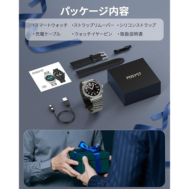 【幅広い互換性&安心のメーカー1+1年】 本スマートウォッチは、iOS11.0以上およびAndroid9.0以上のスマートフォンに対応しています。父の日、母の日、誕生日、敬老の日、クリスマスなどのギフトとしても最適です。さらに、ご購入日より1年間のメーカー付き。万が一製品に不具合やご不明な点があった場合でも、迅速・丁寧に対応いたしますのでご安心ください。 ■お問い合わせ方法: ①アカウントサービス → 注文履歴 → 「販売者に連絡」よりご連絡ください。 ②商品ページの「販売元」に表示されている「質問する」ボタンからもお問合せいただけます。 24時間以内に迅速に対応いたします。 【パッケージ内容】:スマートウォッチ ×1、シリコンバンド ×1、充電ケーブル ×1、日本語取扱説明書 ×1、交換用バネ棒(ピン) ×1ペア、ストラップリムーバー×1。
