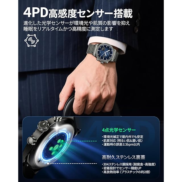 【4PDセンサー搭載&安定性に優れた設計】高精度4PDセンサーを搭載し、導電性に優れたステンレス製の裏蓋を採用することで、センサーが肌にしっかりと密着し、多次元スキャンのように肌の下の健康状態を正確に捉えます。心拍数や血中酸素の24時間常時計測に対応し、リアルタイムで精度の高い健康データを提供します。さらに、30日間の睡眠状態を記録・可視化する睡眠管理、座りすぎや水分補給を知らせるリマインダー、呼吸トレーニング機能など、日常生活に役立つ健康管理機能も充実しています。快適な装着感とともに、日々の健康管理に寄り添う多機能スマートウォッチです。