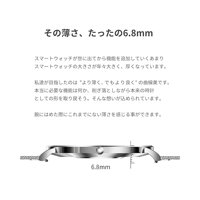 【商品仕様】 時計サイズ(縦*横*厚さ):4.0 * 4.0 * 0.6cm、ベルト幅:18mm、腕周り:約16cm~23cm(本体含む)、材質:ステンレススチール、アプリ:Da FIt ※タブレット端末ではお使い頂けません。 互換性:Android5.0/IOS10.0以上、スクリーン:1.19Inc AMOLED、タッチタイプ:フルスクリーンタッチ、BTバージョン:5.0、Bluetooth伝送距離:約10m、バッテリー容量:135mAh、防水レベル:IP68、充電時間:約2時間、バッテリー持続時間:待機約15日間/通常使用約4日(※常時表示機能や24時間測定等を使用するとバッテリー持続時間が2日程度になります。)