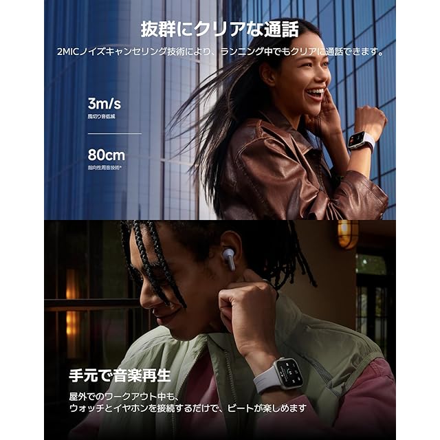 【アップデートしたデュアルマイクノイズリダクション】Bluetoothでお使いのスマートフォンと接続することにより、リモートワークや運動の最中も手元で通話することができます。さらに通話品質の向上のために2つのマイクを搭載し、3m/sの風切り音ノイズリダクションや最大80cmの集音にも対応しました。