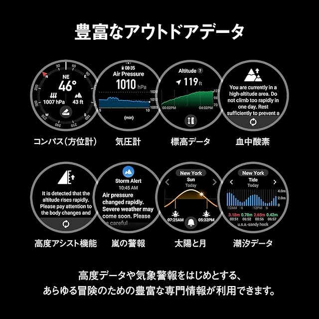 【ステンレススチールボディと卓越したディスプレイ性能】高強度なステンレススチールのベゼルと1.5インチの大画面で2,000nitを誇るディスプレイの融合は過酷な環境下でもあなたを支えます。また、暗い場所で目の疲れを軽減するナイトモードが搭載されてます。【軍用レベルの強靭さ】過酷な温度や環境に耐えるため、9項目の軍事規格の強靭性試験(MIL-STD-810G)をクリアしています。低温モードは、-30度の温度でも腕時計を使用可能で、あなたの限界への挑戦をサポートします。また、10ATMの防水性能を備え、最大45mのフリーダイビングに対応してます。