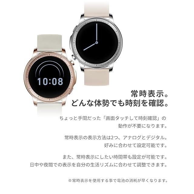 【常時表示AMOLEDディスプレイ。ふとした時に時間を確認できます】待望の常時表示機能が搭載。常時表示の表示方法は2つ、アナログとデジタルを用意しました。アナログデザインが好きな方はアナログを、正確な分数まで確認したい方はデジタルを。好みに合わせて設定可能です。常時表示にしたい時間帯も設定可能です。日中は常時表示をオンにすることでどの体勢からもですぐに時間が可能に。夜中は表示をオフにすることで穏やかな睡眠を。常時表示機能を搭載するだけではなく、その先の用途に拘りました。ディスプレイはハイランクのスマートウォッチに搭載されているAMOLEDディスプレイ。画面をずっと見ていたくなる感覚。なかなか写真では伝わりづらいですが、手にして画面を見るとわかります。自分のお気に入りの写真も鮮明に綺麗に映し出します。