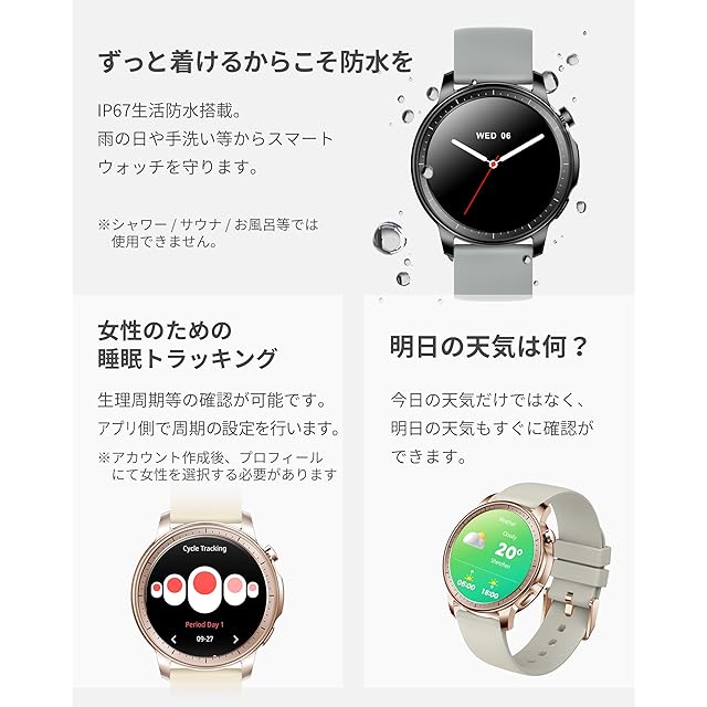【主要機能】「通知対応アプリ:LINE/着信/SMS/Facebook/X(Twitter)/Instagram/WhatsApp/WeChat/Skype/Gmai(アプリ)/Snapchat/Viber/KaKaoTalk/Telegram/QQ」「AMOLED常時表示ディスプレイ」「メッセージ/着信通知」「通話」「連絡先保存」「音声アシスタント」「ステップ数」「消費カロリー」「睡眠記録」「スポーツ測定」「天気予報」「音楽操作」「生理周期管理」「遠隔撮影」「ストップウォッチ」「タイマー」「アラーム」「腕振り点灯」「スマートフォンを探す」「呼吸エクササイズ」「壁紙変更」「明るさ調整」「世界時計」「座りがち通知」