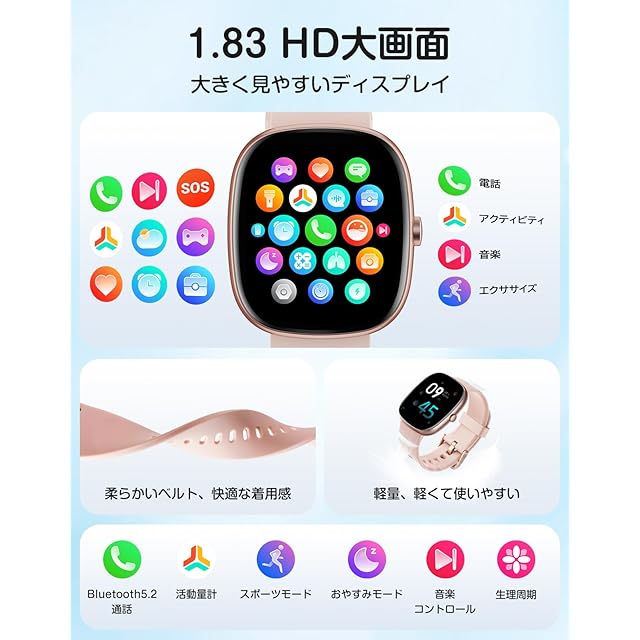 商品名:《新品未開封》HUAKUA スマートウォッチ iPhone アンドロイド対応 Bluetooth通話機能 Smart Watch 1.83インチ大画面 腕時計 100+運動モード 歩数計 着信通知 睡眠管理 天気予報 消費カロリー IP68防水 長持ちバッテリー 長座注意 スマート探す TELEC認証済み
