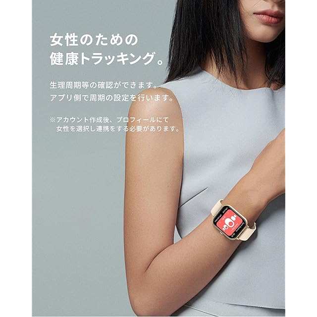 【主要機能】「メッセージ/着信通知」「通話」「連絡先保存」「音声アシスタント」「ステップ数」「消費カロリー」「睡眠記録」「エクササイズ」「天気予報」「音楽制御」「生理周期管理」「ストップウォッチ」「タイマー」「アラーム」「計算機」「腕振り点灯」「スマートフォンを探す」「スマートウォッチを探す」「呼吸エクササイズ」「壁紙変更」「明るさ調整」「スタンドリマインダー」「遠隔撮影」「飲水通知」