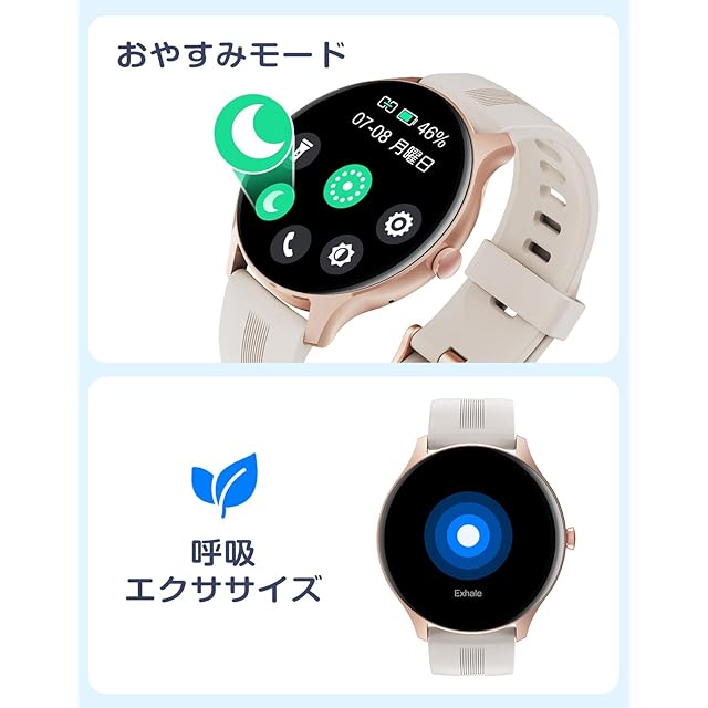 【1.39インチ大画面・200+種類文字盤・音楽制御/再生】1.39インチのフルタッチ円形スクリーンは、高解像度でよりクリアな画面を表示します。明るさは4段階調整可能で、太陽光の下でもスマートウォッチの表示内容をはっきり見ることができます。画面表示時間は5秒、10秒、15秒に自由に調整できます。スマートウォッチには7種類の異なるスタイルの文字盤が付属しており、画面を3秒間長押しし、左右にスワイプすることでお気に入りの文字盤を選択できます。GloryFitアプリに接続すると、200種類以上の文字盤を選択できます。GloryFitアプリは定期的に新しい文字盤を更新し、毎日異なる文字盤を選択できます。また、好きな写真「家族、ペット、アイドル、風景など」をオリジナルな文字盤に設定でき、スマートウォッチの文字盤を見るたびに、元気をもらえます。また、携帯電話と接続すると、ウォッチ本体で音楽を再生できます。 ウォッチ上で携帯電話の音楽再生の「前の曲」「次の曲」「音量」「一時停止」「再生」を操作することもできます。