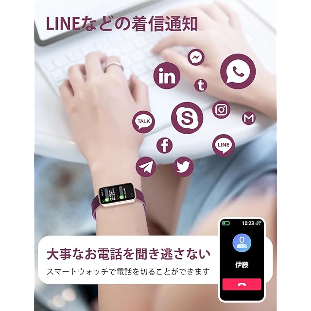 「着信通知機能付き」着信通知機能をサポートしています。電話がかかってきた場合、名前を確認することができ、必要に応じて電話を切断することができます(通話機能はありません)。また、Line、Facebook、Messager、Twitter、Whatsapp、Skype、Linkedin、Instagram、Viber、Gmailなど、多彩なメッセージアプリの通知をサポートしています。手元のスマートウォッチで通知を確認することで、いつでも大切な情報を手軽に確認できます。例えば、会議中や授業中、スマートフォンを取り出すことができなくても、手元のスマートウォッチでメッセージ通知を確認することができます。