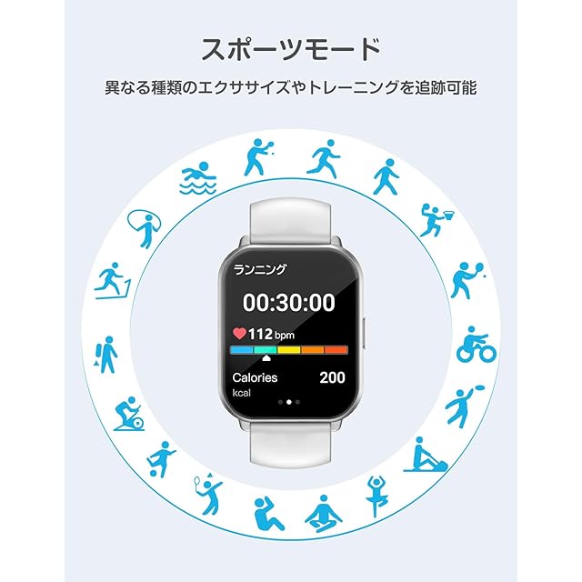 【100+種類スポーツ機能・活動量計】 100種類以上のスポーツモード:ランニング、ヨガ、水泳、登山、徒歩、テニス、サッカー、バレーボール、ダンス、腹筋、ハイキング、卓球、野球などを搭載、運動中のデータを記録し、いつでも運動状況を把握することができます。また、毎日の歩数や歩いた距離も記録されるので、目標値を設定することができます。毎日の運動量を正確に把握することができます、運動不足解消や運動好きな方におすすめです。