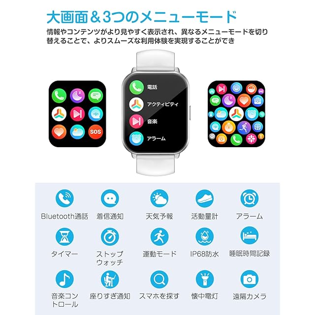 商品名:《新品未開封》スマートウォッチ iPhone/Android対応 Bluetooth 通話機能付き 1.85インチ 大画面 腕時計 歩数計 Smart Watch 着信電話通知 IP68防水 アラーム タイマー ストップウォッチ 天気予報 100+種類運動モード 技適認証取得済