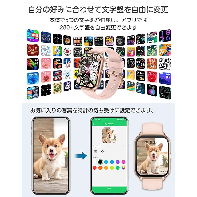 【カスタマイズ文字盤・豊富な機能を搭載】 280種類以上の文字盤デザイン——クラシック、シンプル、クール、かわいいものが揃っています。気分や服装に合わせて時計の文字盤を変えることができ、1日に新鮮さと活力を与えてくれます。このほかオリジナルダイヤルを指定でき、ペットや家族など好きな画像をダイヤルに設定できます。毎日を幸せにします。ストップウォッチ、タイマー、懐中電灯、音楽コントロール、目覚まし時計、座りがちリマインダー、女性の月経周期記録、腕上げ点灯、スマホを探す、明るさ調整など毎日のニーズに応える機能が充実しています。