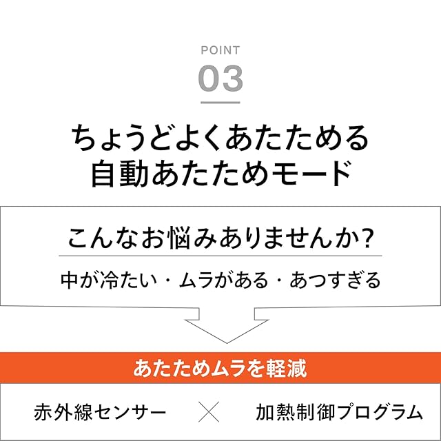 【3つの技術でムラを抑えてあたため。】「赤外線センサー」×「インバーター」×「加熱制御プログラム」の3つの技術を掛け合わせることで、あたためムラを抑え、食材をよりおいしく仕上げます。