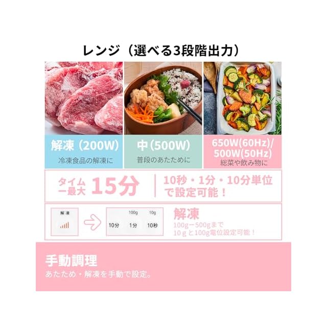 【手動メニュー】食材の種類や機能の選択によって、時間と火力と重量を手動調整でき、手軽に調理を行えます。調理の目安は取扱説明書をご覧ください。また、出力は地域によって異なる場合があります。ご注意してください。