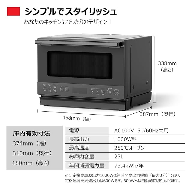 【コンパクト23L&省エネ設計】奥行き38.7cmの薄型ボディ(幅46.8×高さ33.8cm)ながら23L大容量。AC100V 50/60Hz共用で年間消費電力量59.4kWhの性能。過熱防止・チャイルドロック付きで安心してお使いいただけます。
