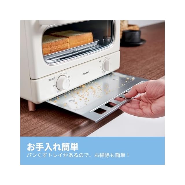 【商品仕様】COMFEE' レトロオーブントースター:◇外形寸法:幅34.6*奥行36.6*高さ23.5cm、約4.4kg ◇庫内寸法:幅27.7*奥行28*高さ19.6cm◇容量:トースト4枚焼き(25㎝ピサ) ◇電源:AC100V ◇最大出力:1300W ◇タイマー:最大30分 ◇ヒーター:3本 ◇温度範囲:80-230℃◇付属品:パンくずトレイ*1・日本語取扱説明書◇設置:散熱のため、上は10㎝、周囲は4.5㎝の隙間を開けてください※ 製品期間:一年間