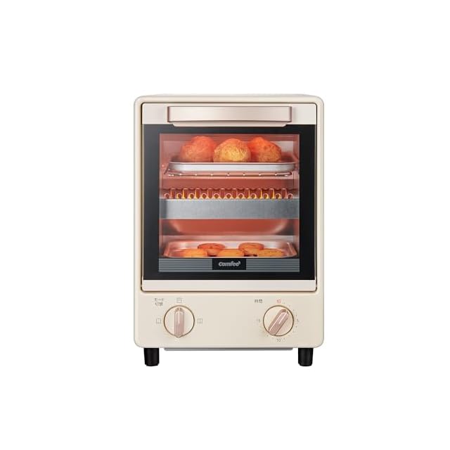 【商品仕様】COMFEE' 縦型オーブントースター:◇コンパクトなサイズ:幅25.8x奥行き23.2x高さ33.3㎝、約3kg ◇容量:8L、トースト2枚焼き ◇電源:AC100V ◇最大出力:1,000W ◇タイマー:最大15分 ◇機能:ピザ・トースト・切り餅・グラタン・バターロールなどの焼き料理◇加熱モード:上下中ヒーター・下ヒーター・上中ヒーター◇電源コード長さ:1m◇付属品:パンくずトレイ*1・受け皿*2・日本語取扱説明書※ 製品期間:一年間