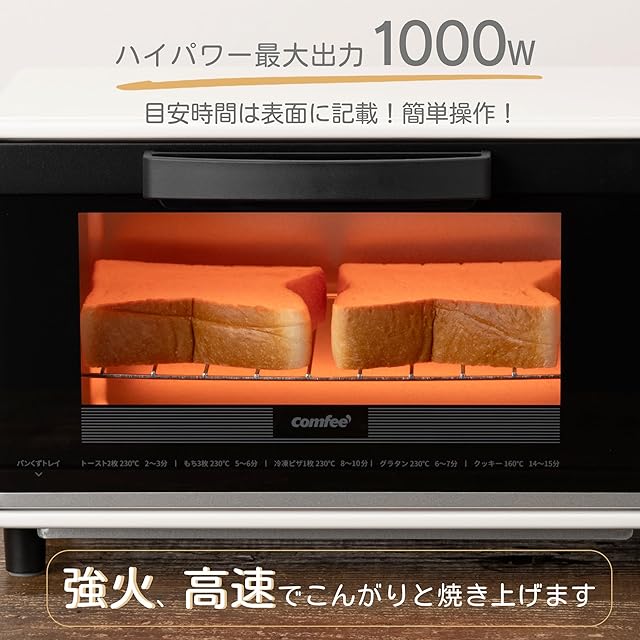 【商品仕様】COMFEE' オーブントースター:◇コンパクトなサイズ:幅36.4x奥行19.8x高さ20.7cm、約2.7Kg◇容量:8L、トースト2枚焼き ◇電源:AC100V ◇最大出力:1,000W ◇タイマー:最大15分◇加熱モード:遠赤外線◇温度調整範囲:80℃~230℃◇電源コード長さ:1.1m◇付属品:パンくずトレイ・受け皿・日本語取扱説明書※ 製品期間:一年間