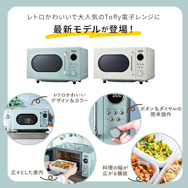 レトロかわいい電子レンジがリニューアル!<br>消音機能と長い電源コードでより使いやすくなりました。<br>シンプル操作はそのままに、コンパクトかつ軽量で様々なシーンで活躍する電子レンジです。<br><br>●内容量は16Lと、ひとり暮らしにもぴったりなサイズです。<br><br>●ターンテーブルのないフラットな庫内は広々使えて、掃除もラクラク!<br><br>●ドリンクやお弁当のあたため、食材の解凍、煮込み料理や蒸し料理などの時短調理もおまかせ!<br><br>●レトロなスイッチ回りは、操作もカンタン!<br>ダイヤル&スイッチのスマート操作で、飲み物のあたためや解凍、加熱もスムーズ♪<br>液晶は見やすいホワイトLEDバックライト仕様。<br><br>●解凍した食材を、【焼く、炒める、蒸す、ゆでる、炊く、煮る】が電子レンジで全部できる「Toffy 電子レンジ用グリルパン」で調理するのもおススメです。合わせ使いで調理時間の短縮に役立ちます!<br>検索は【K-MW3】からお願いします。<br><br>■■Toffy_Classicシリーズ■■<br>ちょっぴりレトロで親しみのあるデザインが魅力。シンプルで扱いやすいスペックと、ダスティカラーが人気のクラシックラインです。<br><br>【商品仕様】品番:K-DR3<br>品名:Toffy 電子レンジ<br>外形寸法:約440(W)×279(H)×335(D)mm<br>加熱室の有効寸法:約261(W)×194(H)×317(D)mm<br>電源:AC100V 50/60Hz<br>定格消費電力:900W/1200W<br>定格高周波出力:500W/650W<br>電源コード長:約1.5m<br>付属品:ユーザーズガイド(書含む)