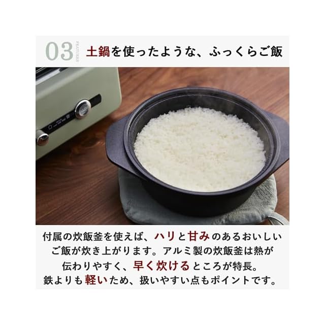 【土鍋を使ったようなふっくらご飯】付属の炊飯釜を使えば、ハリと甘みのあるおいしいご飯が炊き上がります。アルミ製の炊飯釜は熱が伝わりやすく、早く炊けるところが特長。鉄よりも軽いため、扱いやすい点もポイントです。※お米2合まで炊くことが可能。1合の場合28分、2合の場合30分で炊き上がります。(浸水時間は除く)
