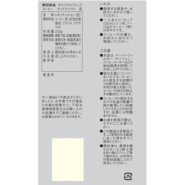 商品名:《新品未開封》無印良品 オリジナルブレンドコーヒー豆 ライトテイスト 200g 83782030