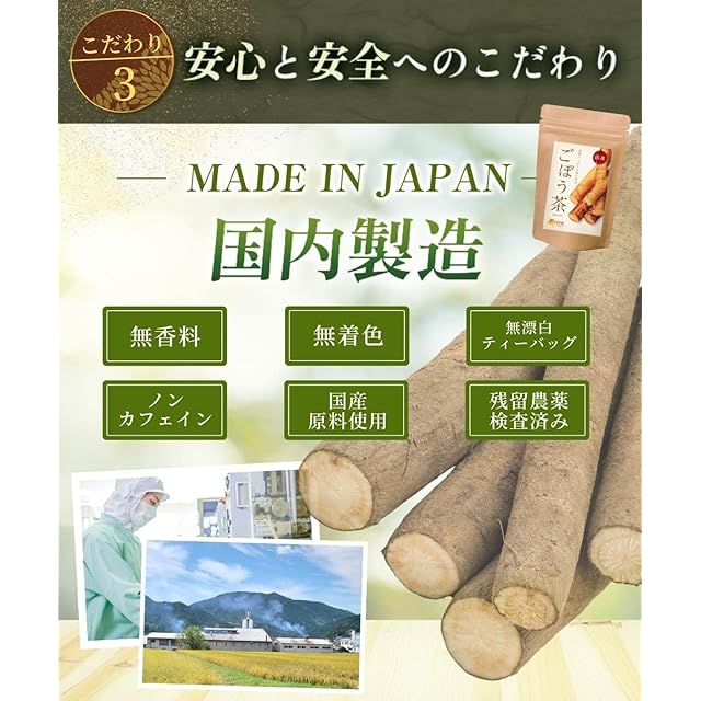 ごぼう茶には食物繊維「イヌリン」が群を抜いて豊富に含まれいます。毎日1杯のごぼう茶で健康生活を始めてみませんか。 ごぼうを皮付きまるごとお茶で食べる、お肌と健康のための新習慣。 国内有機JAS認証工場で充填。放射能、残留農薬検査済み。