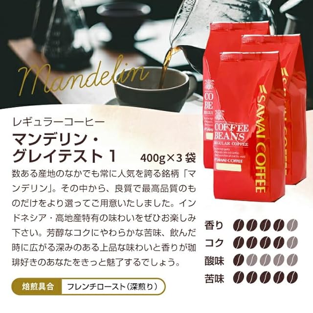 商品名:《新品未開封》澤井珈琲 コーヒー 専門店 マンデリン 1.2kg (400g x 3) 120杯分 大入り セット 【 豆のまま 】 コーヒー豆