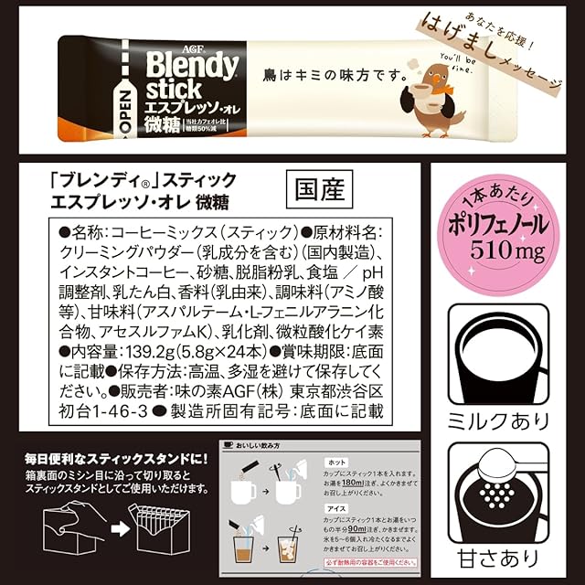 原材料:クリーミングパウダー(乳成分を含む)(国内製造)、インスタントコーヒー、砂糖、脱脂粉乳、食塩 / pH調整剤、乳たん白、香料(乳由来)、乳化剤、甘味料(アスパルテーム・L-フェニルアラニン化合物、アセスルファムK)、微粒酸化ケイ素、調味料(アミノ酸等)