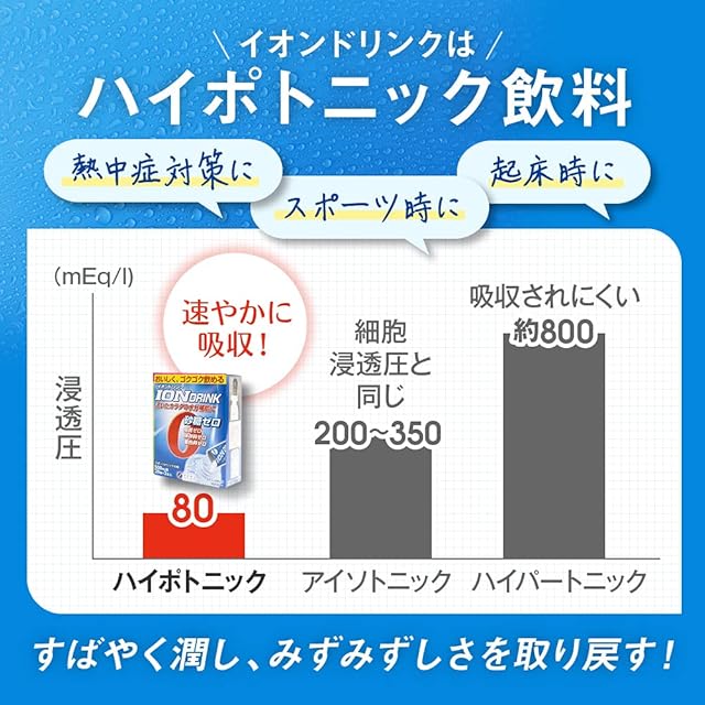 浸透圧80 mosm/Lのハイポトニック飲料です 水やお茶に含まれない電解質が含まれますので、水分吸収効率が良く、熱中症対策にも。しかも糖類は含まれていないので糖類摂取を控えている方におススメです。