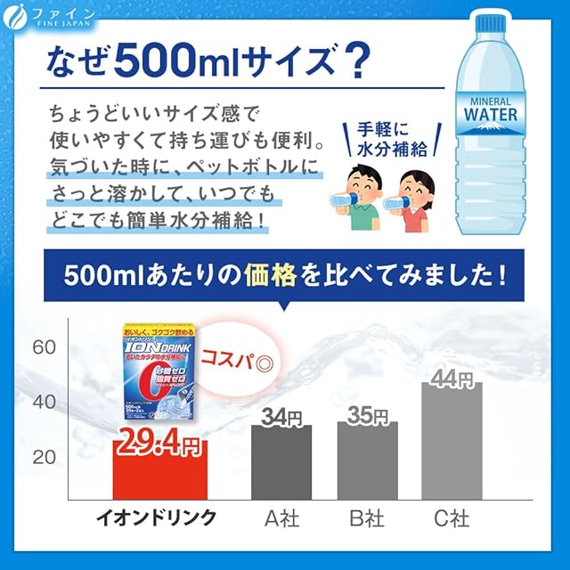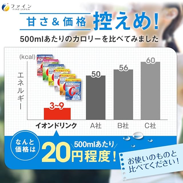 乾いたカラダの水分補給に!ゴクゴク飲めるイオンドリンク。砂糖ゼロ、脂質ゼロ、カロリー94%off。ジムなどスポーツ時・お風呂上り・起床後などに水分を速攻チャージ。渇いたカラダの水分補給、汗で失った電解質の補給にご利用ください。また、エネルギーを作るのに欠かせないクエン酸も配合しています。