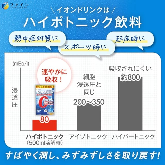 浸透圧80 mosm/Lのハイポトニック飲料です 水やお茶に含まれない電解質が含まれますので、水分吸収効率が良く、熱中症対策にも。しかも糖類は含まれていないので糖類摂取を控えている方におススメです。
