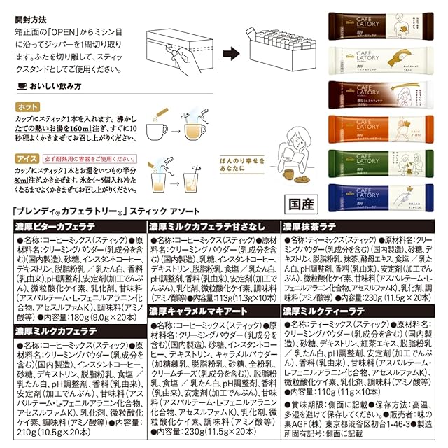 スティック1本あたり内容量:【濃厚ミルクカフェラテ】 10.5g、【濃厚ビターカフェラテ】 9.0g、【濃厚キャラメルマキアート】 11.5g、【濃厚抹茶ラテ】 11.5g、【濃厚ミルクカフェラテ 甘さなし】 11.3g、【濃厚ロイヤルミルクティー】 11g、