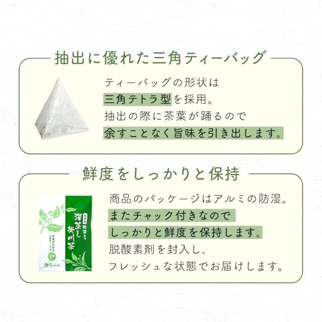 お得で便利な抹茶入り深蒸し茶ティーバッグです。掛川産深むし茶に抹茶をブレンドしました。抹茶の鮮やかな水色と深蒸し茶のまろやかさが楽しめます。お茶屋による精製、焙煎で本格的な味わい。 扱いやすい内容量2.5g入りで、マイボトルにポン!急須にポンと入れるだけ。1リットルポット使用時は2個でご使用ください。