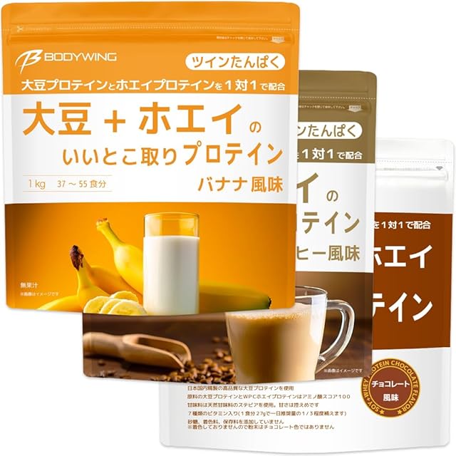 《新品未開封》ツインたんぱく 大豆+ホエイの いいとこ取りプロテイン ボディウイング (3kg, チョコレート・ミルクコーヒー・バナナ 3種類セット)