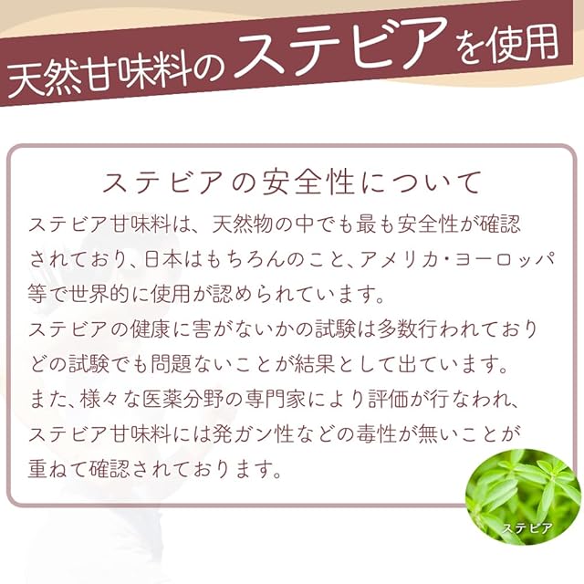 甘味料は天然植物由来のステビアを使用。甘さは控えめです。