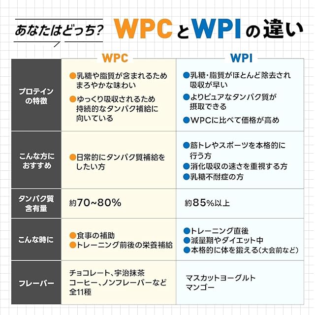 【WPIとWPCの違い】エゾボリックはWPC(ホエイプロテイン)とWPI(ホエイプロテインアイソレート)の2種類のプロテインをご提供しています。本商品のWPIは、WPCから余分な乳糖などの不純物を取り除き、WPCよりも低脂肪でタンパク質の純度や含有率が高く、吸収スピードが早いのが特徴です。筋トレ時に高純度のたんぱく質を摂取したい方、ダイエット中の方、プロテインを飲んでお腹を下しやすい方(乳糖不耐症の方)におすすめです。