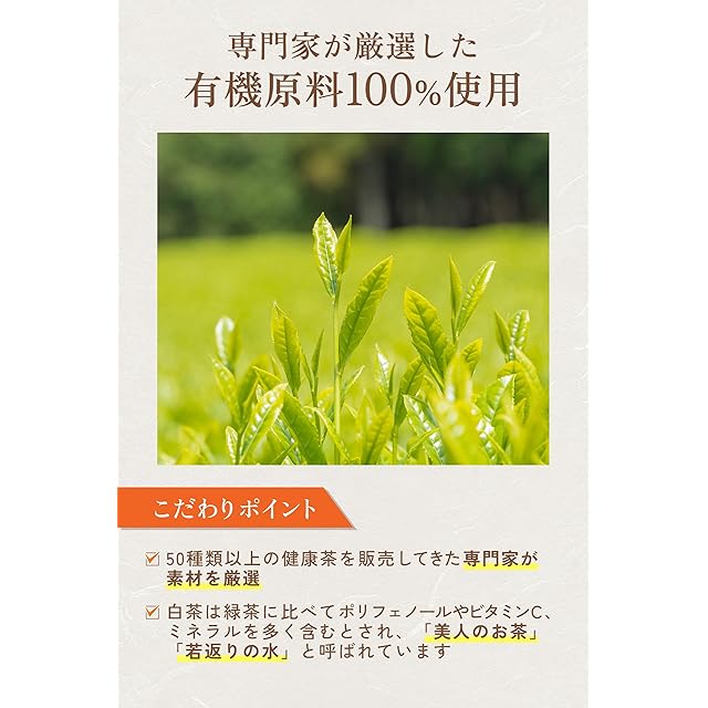 温活農園の白茶リーフタイプ!また衛生管理が徹底された国内の工場で製造された商品をお届けします。また使用するティーバッグは≪無漂白のティーバッグを使用≫ 材質に漂白工程のない不織布を使用している事で、毎日安心して続けていただけます。